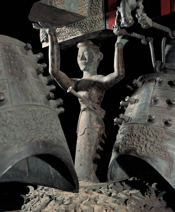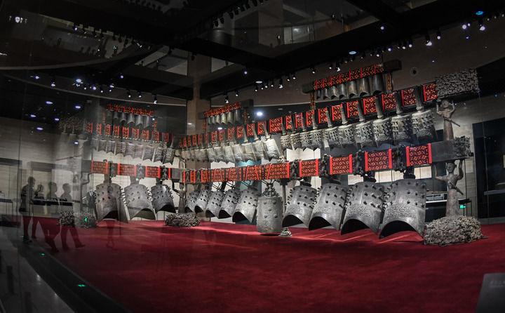展厅正中,三层八组65件青铜编钟的原件,巍然悬挂在曲尺形的铜木钟架上。近5吨的重量全部由6个青铜佩剑武士立柱支撑,历经2400多年稳如泰山。