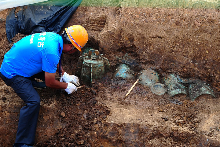 2013年7月4日,在M111墓葬内,工作人员在对编钟进行挖掘工作。新华社记者肖艺九摄