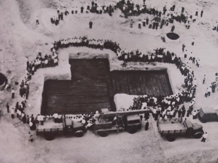 位于曾都区城西的擂鼓墩是又一处密集分布的战国时期曾国高等级贵族墓群,曾侯乙墓就静静地躺在这里的一处坡岗上。俯瞰深达13米的墓葬原址,不规则多边形的椁室形制分东、中、北、西四室,由底板、墙板、盖板共171根巨型长方梓木和榉木垒迭套接而成。