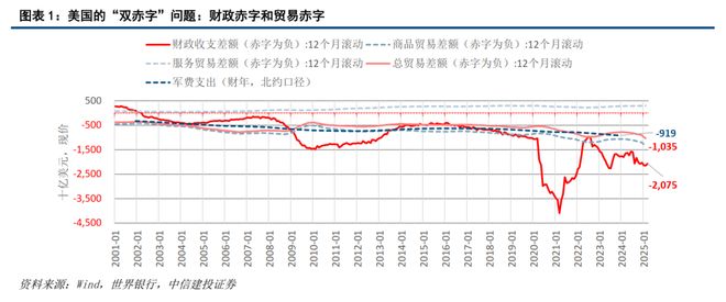 美国近三十年来出现持续的“双赤字”,贸易赤字只是表象,财政赤字才是核心根源——但财政赤字的调整往往需要深刻的自省改革、艰巨的选民教育,在少数民粹主义短视政客的眼中,远没有以对外贸易为借口、掩盖内部矛盾来的“看似容易”。如图表1,截至2025年3月,美国的12个月滚动财政赤字已超过2万亿美元,远超国际贸易赤字的10350亿美元规模; 2024财年,仅军费开支就接近1万亿美元,特朗普已表示2025财年的军费开支预算将超过1万亿美元。