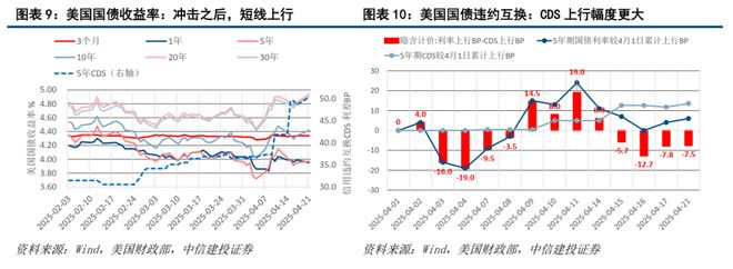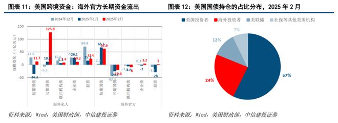 从4月2日特朗普开启本次贸易战以后,美国国债市场出现了较显著的信心危机,主要期限国债利率不降反升,以国债违约互换CDS计价的违约风险上行快于利率上行,反映了国债市场既在开始计价经济衰退,又在开始计价主权信用违约。如图表9-图表12:1)截至4月21日收盘,较贸易战开始的4月2日,5年期美国国债违约互换CDS上行约13BP,5年期美国国债收益率上行约6BP,去掉违约风险补偿增加部分,隐含的国债利率下行约7BP;2)截至最新公布的2025年2月数据,海外官方资金继续对美国长期资产保持减持状态,海外官方和私人投资者合计持有约8.6万亿美元美国国债,占市场总规模的约24%。