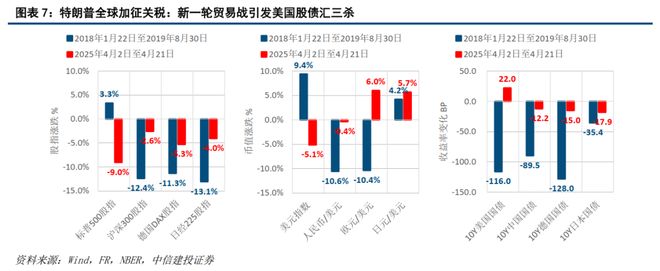 4月2日,特朗普宣布将对全球加征高额关税,开启新一轮的贸易战,但引发了美国自身的股债汇三杀。如图表7,从4月2日至4月21日收盘数据,美国发动本轮贸易战以来,其股市下跌、汇率下跌、债市下跌的“三杀”走势,远弱于其在2018-2019年上次发动贸易战的关税加征和措施升级阶段,同时,也较明显弱于德国、欧元区、日本、我国等重要非美市场。