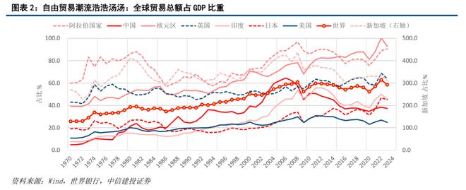 随技术进步带来全球更紧密互联互通,当前全球贸易总额占全球GDP的比重,已从英国工业革命前的不到1%攀升至2023年的约60%,多数国家深度融入全球经济分工合作,任何国家的逆全球化和贸易战企图,都是不合经济道理、不得世界人心、没有出路的。如图表2,全球众多经济体年贸易总额占GDP比重在40%以上,新加坡等外贸型国家的贸易总额占GDP比重超过300%,多数经济体不会认同极限施压的贸易战举措。
