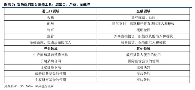 贸易战的常见工具是加征高额关税,但除此之外还有其它各类工具。如图表3,在进出口、金融、产业等经济领域,还可有资产冻结、资金审查、国际金融系统准入等措施。