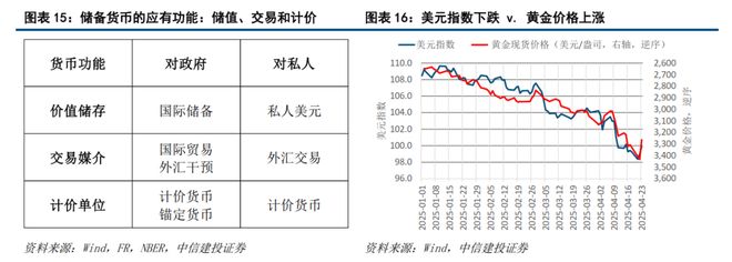 2.3 美元其三:铸币稳定被动摇,美元跌破荣枯线日特朗普开启本次贸易战以后,美元指数加速走弱,贸易战的一系列当前和后续潜在措施,动摇了美元作为全球储备货币的三大功能,即价值储存、交易媒介和计价单位,同时,特朗普在贸易战内外压力下,持续就美联储货币政策和人事任免表态,进一步削弱了全球对美元维持储备货币自律的信心。如特朗普继续坚持贸易战和削弱美元储备货币功能,则后续美国的美元贬值预期、政府债务压力、流动性宽松预期、经济衰退预期、全球公共服务和美元金融体系武器化等问题将进一步凸显——则全球央行、外汇储备、主权基金等大型财富管理机构将进一步调降美元资产的配置比例,欧元、黄金、人民币等非美元资产将进一步接受由美国市场流出的全球资金再平衡收益。