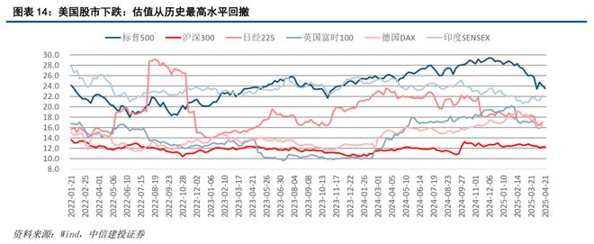 从4月2日特朗普开启本次贸易战以后,美国股票市场出现了较显著的信心危机,由于担心贸易战冲击企业营收,尤其是上市企业中的跨国企业、科技企业和消费企业,标普500等核心指数从历史最高估值开始回撤,美股科技七巨头向下领跌。如图表13-图表14,截至4月21日收盘,美股标普500指数的滚动市盈率约为23.5倍,从前期历史性高点的约29倍开始回撤,但仍属于历史较贵、全球最贵的估值水平,美股较德国、日本、英国、我国等全球其他主要股市的市盈率仍偏贵约10倍左右——如贸易战继续而不撤除,这部分估值溢价将持续受到信心减弱、资金流出、经济前景黯淡等因素的多重冲击。