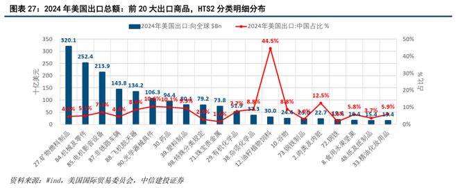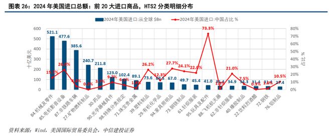 如图表26-图表27,按世界海关组织的国际贸易商品名称协调编码制度(Harmonized Commodity Description and Coding System, 缩写HS;美国海关使用其美国衍生版本,Harmonized Tariff Schedule,缩写HTS)的二级商品分类(有99个二级分类,即HS2/HTS2目录下的大类商品1-99)——2024年美国进出口商品规模较大、或集中度较高的主要行业,主要有:机械及零件(84)、电机影音设备(85)、非铁路车辆(87)、矿物燃料制品(27)、药品(30)、光学器械具件(90)、玩具及配件(95)、鞋类及零件(64)、飞机航天器(88)、油籽植物饲料(12)、铜制品(74)等——完整的2024年美国总出口和总进口的HTS2分类明细,与其中的中国份额占比,可参见文末的附录B和附录C。
