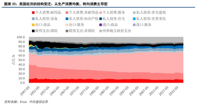 “例外论”还体现在美国的经济结构的韧性上。美国经济以消费驱动为主,美国经济高度依赖内需,消费支出占GDP的比重长期超过70%。稳定的消费需求为经济提供了持续增长的动力,并在2008年金融危机和其他经济冲击中表现出较强的韧性。产业结构上,美国科技和服务业占主导地位,这种结构使其在疫情后恢复速度快于依赖制造业或出口的经济体。