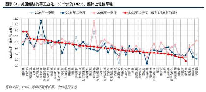 在特朗普发动贸易战的背景下,美国经济或将面临生产效率下移,及产出进一步走弱的内生结构性压力,全球历史上以贸易战实现产业健康发展的成功案例几乎未有,反而是贸易封禁拖累产业进步的故事俯首皆是。如图表 33-图表34,截至2024年底,美国的居民消费占GDP比例已达68.1%,其中,居民服务消费占GDP比例达到46.8%;一个较独特的视角是,由于往往面临直接数据不足或滞后,部分数据研究者选择以空气中的PM2.5颗粒污染物浓度变化,作为监测工业生产、交通运输、建筑施工和燃料发电等整体运行水平变化的指标——从近期美国50个州的PM2.5情况看,剔除冬季等季节性因素扰动,整体平均数值较上年同期基本不变,继续保持在PM2.5空气颗粒浓度的非常低位水平。