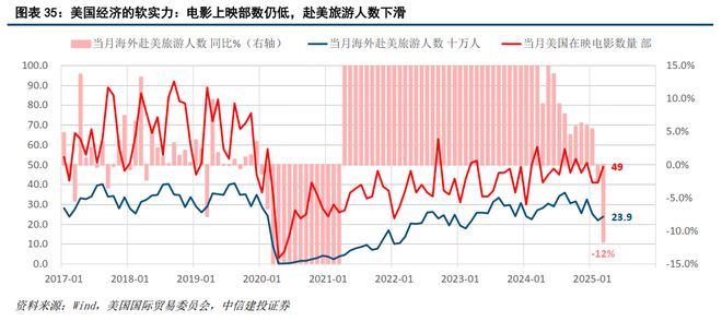 本次贸易战如继续,可能将损害美国在文化、旅游与娱乐等领域的全球影响力,削弱其过去经由长期的经营培育所建立的经济软实力。如图表35,根据美国国际贸易委员会数据,近期的3月赴美旅游人数加速下滑,旅游业是美国常年的贸易顺差行业,据美国旅游协会估计,2024年旅游业为美国经济带来1.3万亿美元收入,支持了1500万个就业岗位;另外,文化娱乐方面,近期的3月美国电影上映部数是49部,也仅恢复至2019年疫情之前的50-90部左右的区间下限。