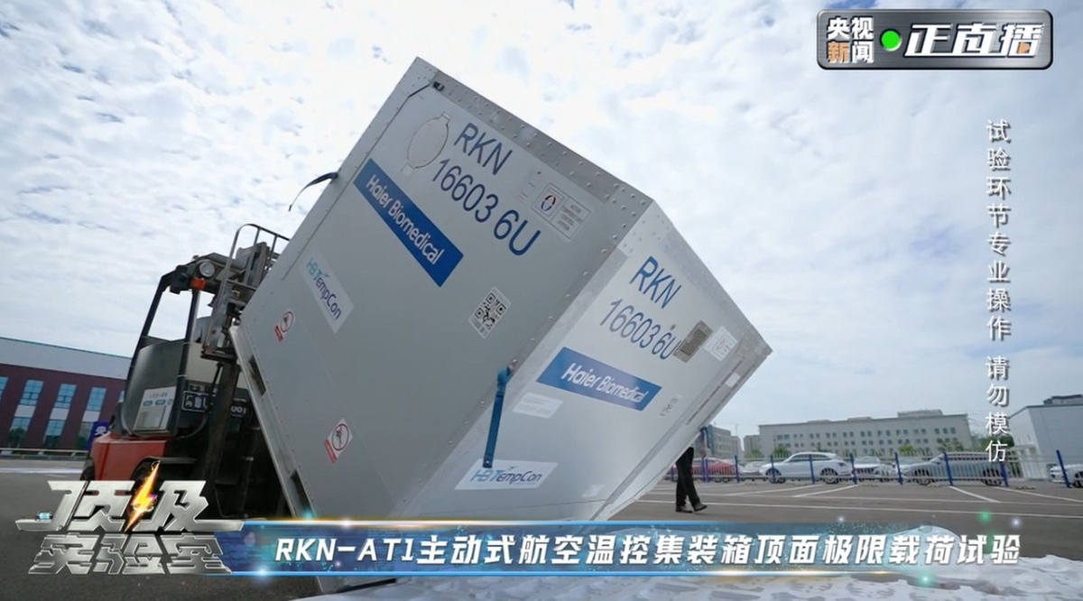 在海尔生物医疗检测技术中心,“磕科团”现场参与主动式航空温控集装箱极限载荷试验,分别进行了3.4吨载荷下,箱体倾斜45度,箱体背(侧)面承重能力测试;以及4.4吨载荷下,箱体凌空,顶面承重能力测试。